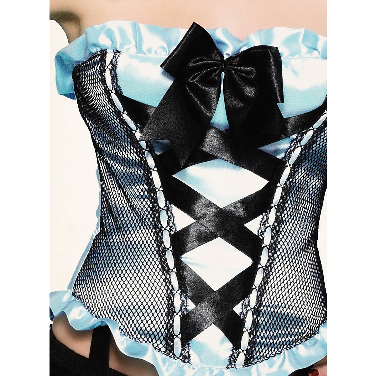 Die trägerlose Corsage besticht durch ihren Materialmix: Seiten und Rücken sind aus zart schimmerndem, türkisfarbenem Satin. Die Frontpartie ist mit Netzstoff überzogen und mit einer dekorativen, schwarzen Zierschnürung versehen. Eine große, schwarze Satinschleife am Dekolleté sowie verspielte Rüschen am Saum runden das Design ab. Eingearbeitete Stäbchen und eine echte Schnürung im Rücken sorgen für die perfekte Passform und eine traumhafte Taille.